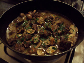 Boeuf BourguignonIngredients: (serves 6) 700 g beef/ steak 100g bacon 50g butter 1 large onion 1 cup of button mushrooms 1 cup of peas 30g flour 300ml red wine(optional) 300ml beef stock 1 bouquet garni ( a mixture of dried herbs will also do) Method: 1. cut the beef and bacon into chunks 2. in a large heated skillet or pan melt the butter and add the onion and bacon 3. fry for 5 minutes and remove from pan 4. Now add the beef until browned and then gently sprinkle the flour in 5. fry for 2 minutes and then slowly add the beef stock 6. add the bacon, onion, salt, pepper, red wine and bouquet garni. cover and simmer on a low heat for 2 hours 30 minutes 7. 30 minutes before the end of cooking, season and add the mushrooms and peas 8. serve with steamed baby potatoes or noodles |